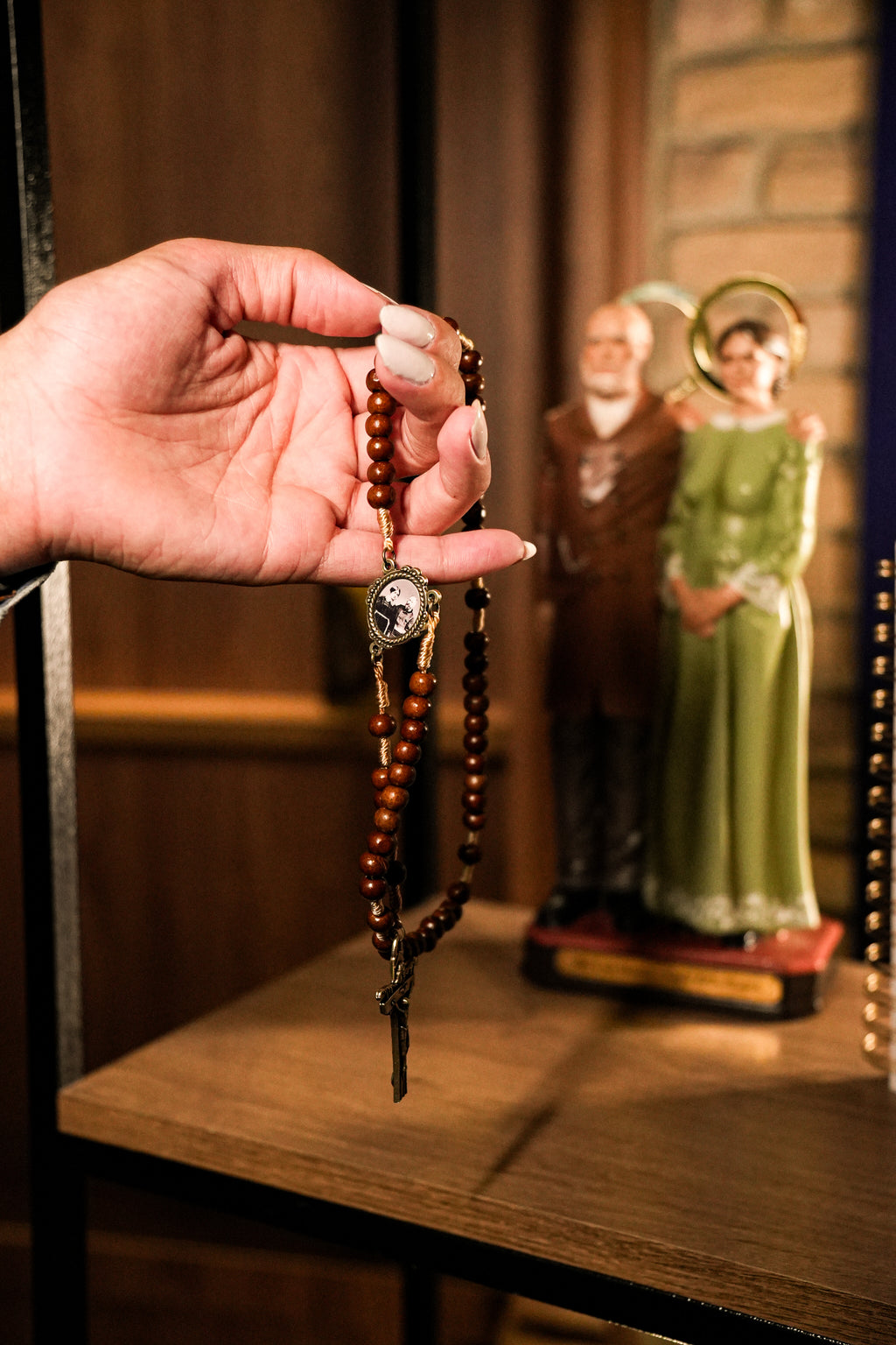 Produzido em madeira natural, traz contas firmes e resistentes, unidas por cordão, além de um crucifixo detalhado em metal. No centro, a medalha de São Luís e Santa Zélia recorda a santidade da vida familiar, tornando-o especial para orações em casa, grupos ou como presente de fé.