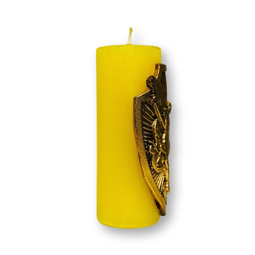 Vela artesanal de São Miguel Arcanjo, confeccionada pelos Monges Beneditinos da Abadia da Ressureição, feita com parafina amarela e pavio de algodão medindo 15cm, com aplicação da imagem de São Miguel Arcanjo em dourado em cera. Acesa significa o ardor de uma alma que se dá amorosamente a Deus. A chama acesa da vela também representa a oração de um coração que mantém a fé viva.